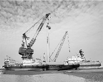 图为在江苏如东海上风电场,风机吊装现场(资料图片)。