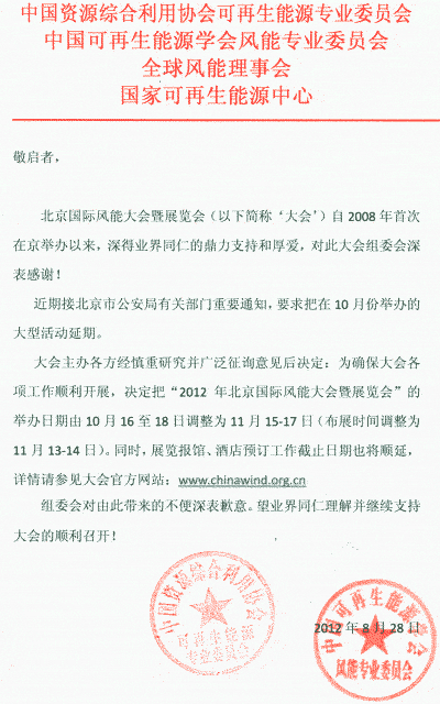 【风电展会】北京国际风能大会暨展览会(以下简称‘大会’),根据北京市公安局有关部门重要通知,要求把在10月份举办的大型活动延期。大会举办日期将调整为11月15-17日。