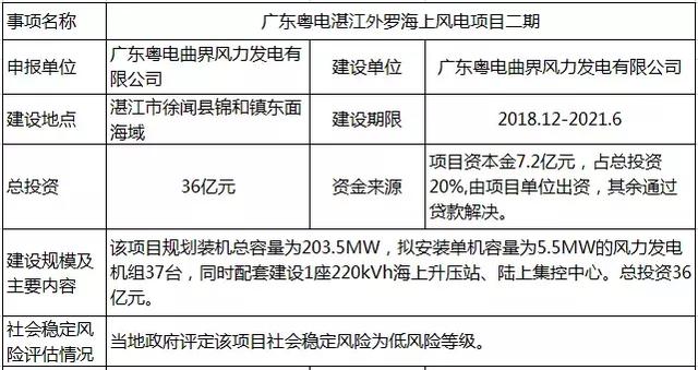 近日,广东粤电湛江徐闻外罗海上风电二期项目获湛江市发改委核准,该项目规划装机总容量为203.5MW,拟安装单机容量为5.5MW的风力发电机组37台,同时配套建设1座220kVh海上升压站、陆上集控中心,总投资36亿元。