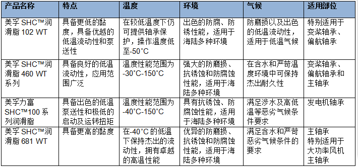 配合这一发展趋势,国内主要风电机组制造商已积极投入到大功率机组的研发与安装工作上,但大功率风机的轴承需要承受较重的载荷,这就对运行的可靠性提出了更高的要求。此次全新推出的美孚SHC™润滑脂681 WT,正是埃克森美孚与设备制造商紧密合作,基于大功率风机需求研发,专门设计应用于重负荷的风机主轴承,以满足风电市场对于大功率机组的发展需求。该产品拥有良好的粘温性能,即使是在含水和严苛温度下仍可为设备提供出色的轴承保护;其突出的抗磨损、抗锈蚀和抗腐蚀性,能帮助重载轴承有效“抗压”,帮助提高其可靠性和使用寿命,从而帮助客户较大程度地减少非计划停机时间并降低维护成本,切实提高生产效益。