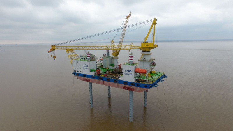 据悉,“华电稳强”号是蓝德公司为适应浅海风机维护、近海6兆瓦及以下大功率风机的市场需求,向润邦海洋定制的海上风电作业平台,该平台于2018年1月开工建造,是一型集“风电基础施工、风电塔筒、塔架、机舱、轮毂、叶片”安装与维护为一体的风电作业平台。平台全长120米、型长78米、型宽38米、型深6.8米、吃水3.8米、艏部配置一台600吨绕桩式全回转起重机、最大吊高 110米;平台左舷艉部配置一台100吨的辅助吊机,辅助吊机与主吊机配合作业,可完成叶轮整体吊装或其他需要翻身、维护的工作。