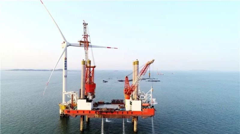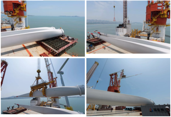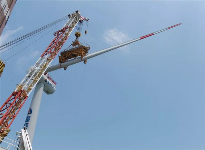 23日上午9点,首只叶片开始起吊安装,连续吊装9个小时后顺利完成三只叶片的安装。“这7MW的风机,塔筒高达90余米,机舱重达400余吨,叶片长度有75米,要完成这个‘巨无霸’的安装,本身就有很大的难度。这次我们在短短的45个小时内完成风机吊装任务,创造了我们行业的新纪录。”中铁福船现场吊装总指挥凌剑激动地说。