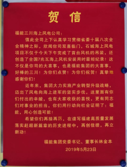 “集团党委书记、董事长林金本深夜发来贺信,对三川公司项目建设攻坚活动取得阶段性成果给予了充分肯定,体现了集团党委对项目建设者们的无限关怀,既是鼓励,更是鞭策!希望全司上下认真学习领会,戮力同心,再接再厉,早日实现集团首个海上风电项目并网发电目标,为集团实现高质量发展、落实省委赶超战略添砖加瓦,以实际行动回报集团对我司的信任!三川,一定能!”三川海上风电公司董事长江兴荣鼓励全司员工。