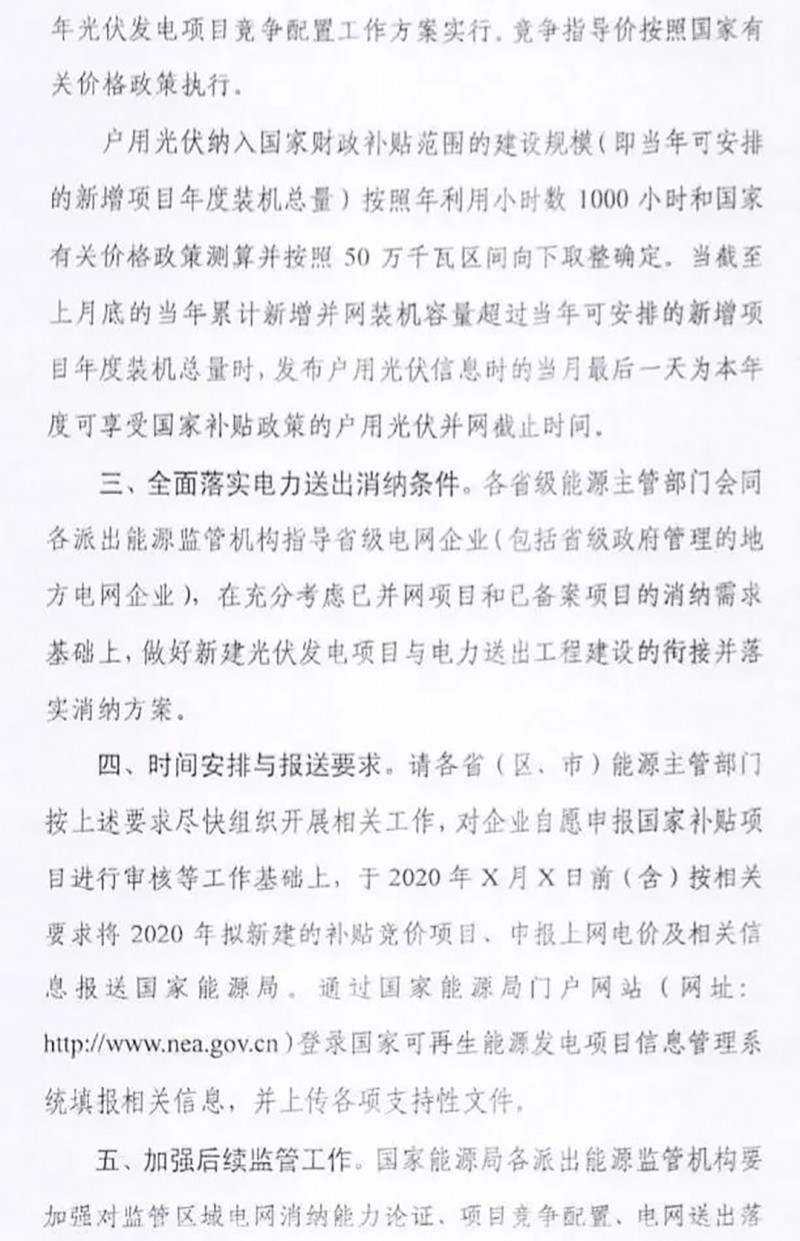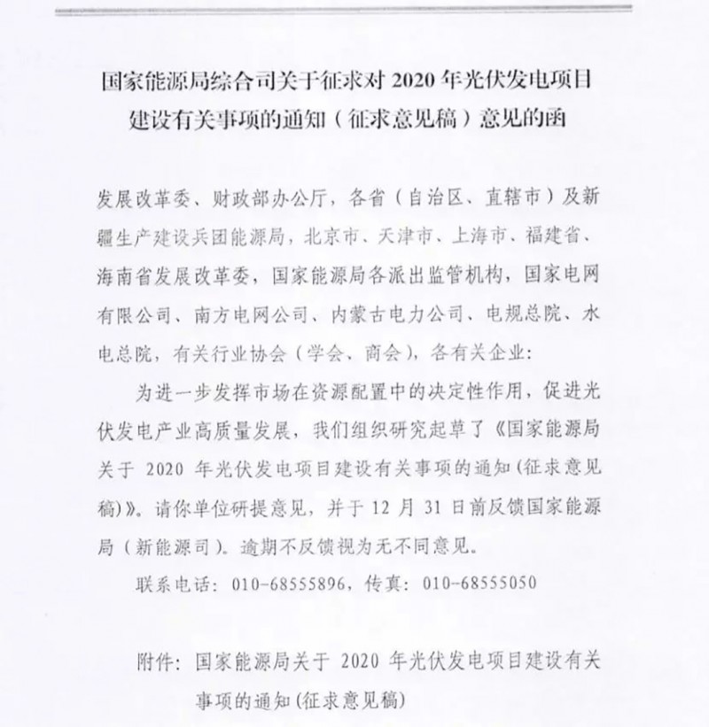 近日,国家能源局下发《关于征求对2020年光伏发电项目建设有关事项的通知(征求意见稿)意见的函》。