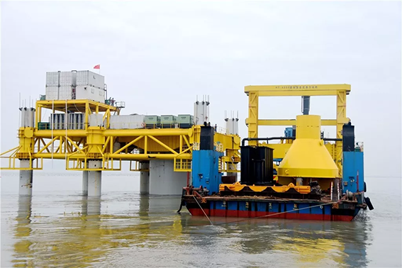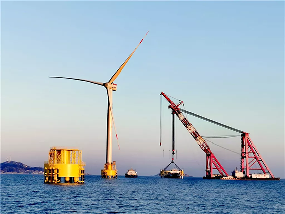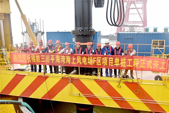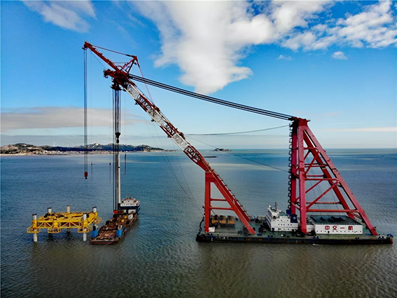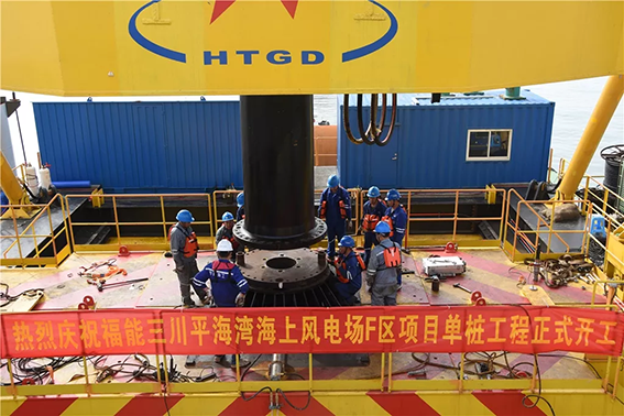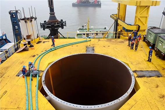 “瞧,不远处那艘大船,中交一航花大气力调来了有着‘精兵铸就港珠澳,强舰名留伶仃洋’美誉的一航津泰起重船。主要用于一、二级护筒和单桩的翻桩、起吊就位,辅助桩、稳桩平台的安装以及锤、钻机的安放。该船长120米,最大起重能力4000吨,曾在港珠澳大桥吊装立下赫赫战功。有这样的‘大国重器’助力,我们的工程施工很有底气。”三川风电水工技术员蔡烨介绍。