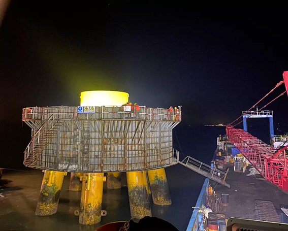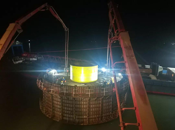 施工前,项目部统筹部署,组织专人驻扎海上工程一线,进行钢筋绑扎、预埋件、接地电阻等验收工作,按照要求布置及调试大体积混凝土温控设备。施工过程中,多部门联动、昼夜奋战,紧盯施工安全,控制浇注速度,保证混凝土分层振捣质量。承台浇注完成后,项目部积极总结经验,及时对承台进行蓄水保养和冷却水循环,做好承台温控工作。