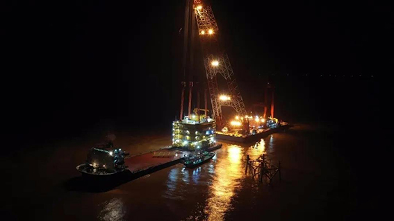 国家电投滨海南H3海上风电场海上升压站上部组块采用五层布置,重量约3030吨,基础施工及海上吊装难度巨大。面对艰巨任务,项目部迎难而上、积极应对,通过反复研究论证施工方案,组织国内相关领域专家对升压站海上施工方案进行评审,结合国内海上现有船机等施工机具的实际情况,研究制定了一套操作性强、安全可靠、经济可行的施工方案,顺利完成海上升压站上部组块吊装。至此,公司已在江苏盐城海域相继顺利完成国家电投滨海北H2、大丰H3、滨海南H3等三座海上风电场海上升压站的建造和安装。