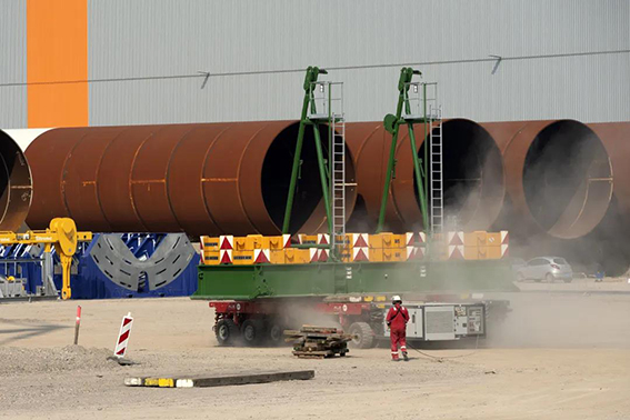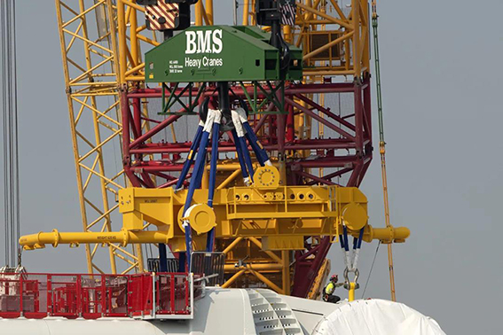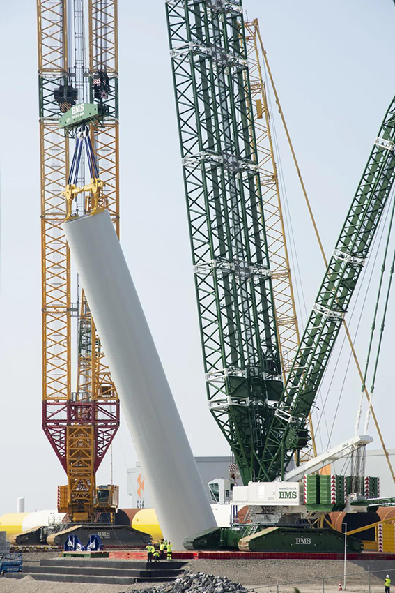 来自丹麦的BMS集团赢得了安装这台风机的订单。这家从事起重作业、工程、重型运输和特种运输的专家不仅活跃在欧洲,而且在澳大利亚、南非和美国也非常活跃。在鹿特丹,BMS集团使用两台LR11350履带式起重机安装12兆瓦的风机,在某些情况下使用了抬吊的方式。其中一台履带式起重机是直接从位于爱茵根的利勃海尔工厂的生产线运到现场的。