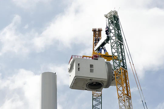 2019年12月爱茵根 / 多瑙(德国)- 数周前,目前全球最强大的海上风力发电机在荷兰鹿特丹港被架起。该风力发电机机舱总高为207米,净重675吨。这是用于该吊装工作的两台利勃海尔履带式起重机所能承受的极限吊重。在抬吊过程中两台利勃海尔LR 11350起重机成功地吊起了780吨的总负载,并将这庞大的部件安装在150米高度的巨型风机塔筒上。