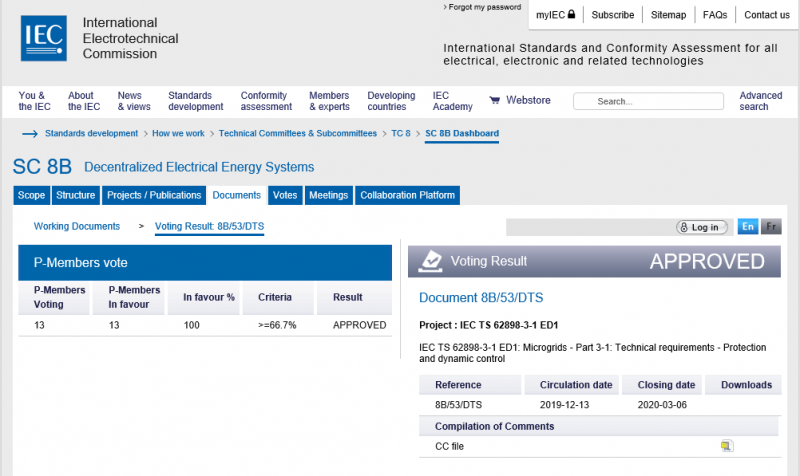 近日,由新疆金风科技股份有限公司(下称“金风科技”)全资子公司北京天诚同创电气有限公司(下称“天诚同创”)提出并牵头制定的国际标准《微电网 第3-1部分:技术规范-保护和动态控制》(下称IEC TS 62898-3-1)获国际电工委员会分布式电力能源系统分技术委员会(下称IEC/SC8B)以100%的赞成票率批准通过,预计将于2020年11月正式发布。
