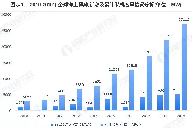 根据世界海上风电论坛(WFO)发布的数据显示,2019年,全球共新建海上风电场16个并投入运行,共新增装机容量5.2GW;主要分布在中国、英国、德国、丹麦、比利时、台湾地区。截至2019年底,全球已投运海上风电场共有146个,累计装机容量达到27.2GW,同比增长23.4%。综合来看,全球海上风电市场运行较为稳健,保持持续增长态势。