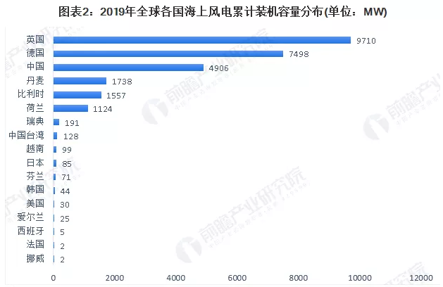 从全球各国已投运海上风电场的装机容量对比来看,英国仍然占据领先地位。2019年,英国海上风电累计装机容量达到9.7MW;其次是德国,海上风电累计装机量7.5GW;中国是全球海上风电第三大市场,累计装机容量4.9GW。