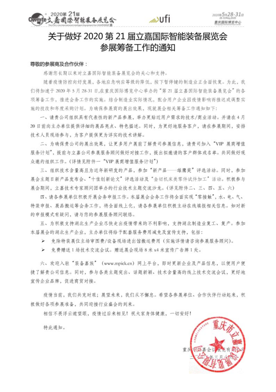 随着疫情防控向好发展,各地应急响应等级的降低,按下暂停键的制造业正全面恢复。为此,我们将加速于2020年5月28-31日,在重庆国际博览中心举办的“第21届立嘉国际智能装备展览会”的各项筹备工作,推进会务工作的实施。结合制造业实际情况,配合用户企业因疫情影响而推迟或调整实施的技改和年度采购计划。为确保参展商的展出效果,现就展会相关筹备工作通知如下:
