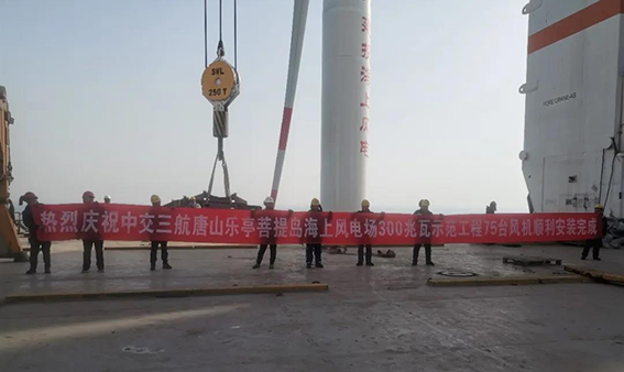 该工程位于京津冀区域中心城市唐山,风电场装机总容量为300兆瓦,共安装75台单机容量为4兆瓦风机机组。基础形式分为36台高桩混凝土基础和39台单桩基础。作为第一个北方总包项目,新能源公司承建了其中的15个高桩混凝土基础施工和75台风机安装任务。期间,项目部克服了渔网拆迁、供货和船机紧张等诸多困难,顺利完成施工任务,用实际行动兑现了对业主的承诺。