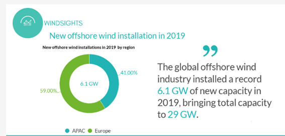 从全球风电市场区域分布看,欧洲仍是海上风电主要市场,新增装机占全球59%;亚太地区占41%。
