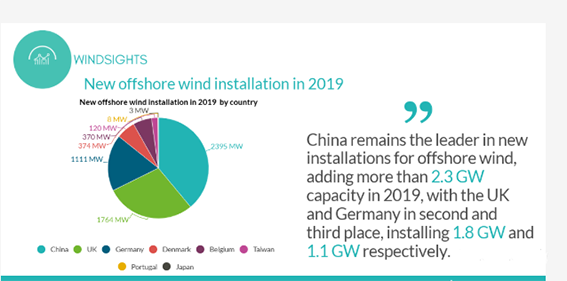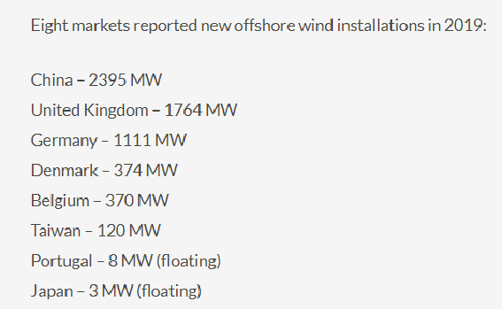 WindDaily获悉,全球风能理事会(GWEC)近日正式发布全球海上风电权威数据:2019年全球新增海上风电装机6.1GW,创历史新高,累积装机达到29GW;全球新增装机前三是:中国(2.3GW)、英国(1.8GW)、德国(1.1GW)。中国首次超越英德,跻身全球新增装机第一大国。