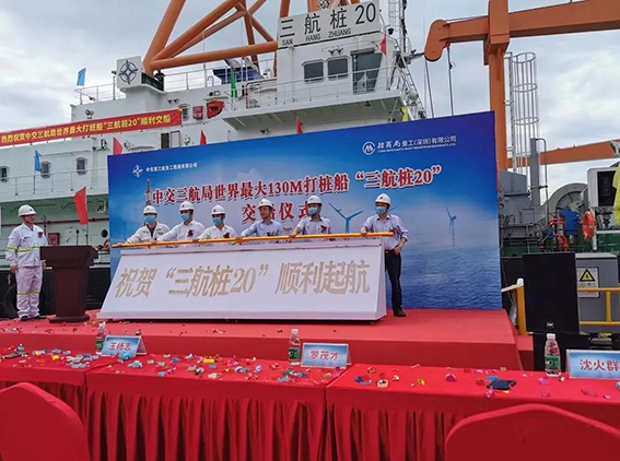 5月8日,中交三航局133米打桩船“三航桩20”交船仪式在深圳招商重工孖洲岛造船基地举行,标志着目前世界最大的打桩船正式诞生。三航局副总经理尹建兵,三航局工程管理部执行总经理沈火群,三航新能源公司执行总经理王国平、副总经理卢益峰,中国船级社深圳分社总经理罗茂才和船舶检验处苏旌处长,招商局重工(深圳)有限公司总经理王杨志及有关负责人参加了交船仪式。