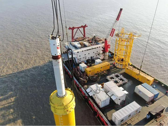 2020年1月20日,YC2500液压锤击打钢桩的声音第一次在江苏射阳海域响起。每一锤都铿锵有力,掷地有声。历经2020年春节新冠疫情影响,4月份项目复产后,在现场项目人员的精心组织下,仅在18天的有效窗口期内,高效完成了6根高难度沉桩任务,其中最快的一根桩在2小时内连续锤击2000次,顺利完成沉桩任务,其效率高、性能稳,丝毫不逊色国外进口设备。
