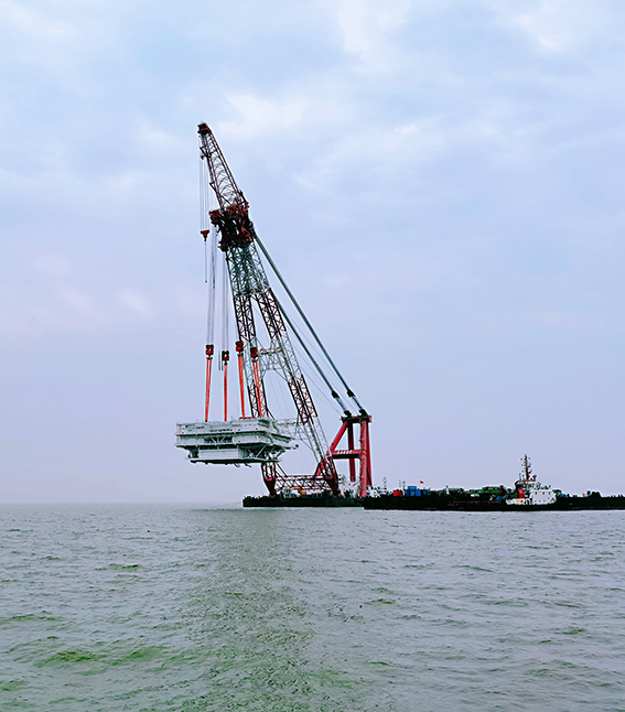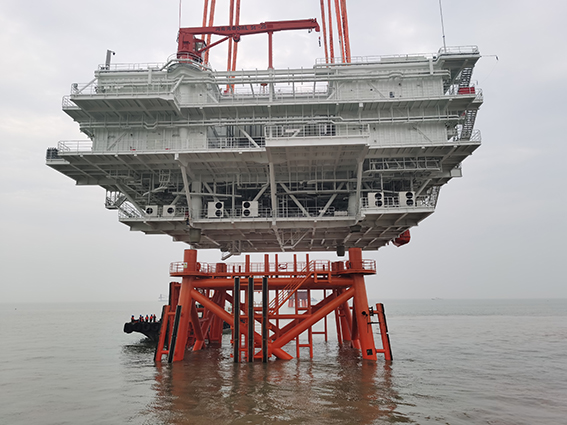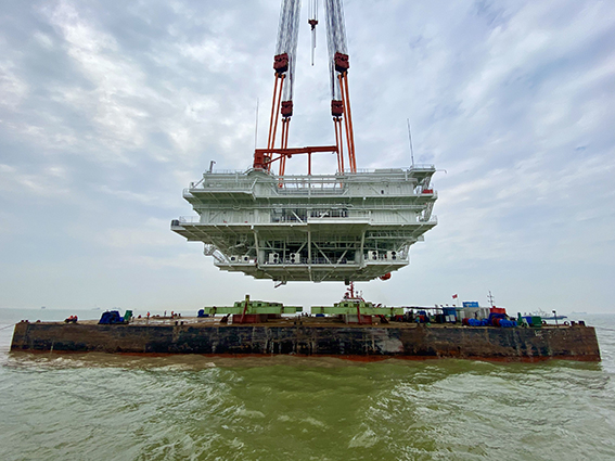 嘉兴1号海上升压站模块是杭州湾内第一座300兆瓦海上升压站,上部组块采用四层布置,平面尺寸41.20mx46.60m,高16.288m,重量达到3400吨,海上吊装难度巨大。面对困难,项目部迎难而上、积极应对,提前做好各项风险管控预案,并对施工方案进行反复研究论证,最终研究制定了一套操作性强、安全可靠、经济可行的施工方案,顺利完成海上升压站上部组块吊装。