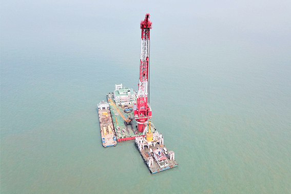 此次沉桩成功的“定海神针”长75米、重931吨、直径6.5-7.48米。全体人员于5月25日正式进场,经过充分准备,最终于5月28日12时38分打响沉桩第一锤。在随后的沉桩施工过程中,项目部连续克服涌浪、阴雨、大雾等天气,经过3小时的奋战,累计打桩1537锤,最终高质量完成了此次沉桩任务。
