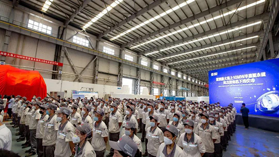 中国风电新闻网讯:6月3日,由中车永济电机公司自主研制的10MW半直驱永磁风力发电机在山东东营成功下线。中国可再生能源学会、北京鉴衡认证中心、中国农机协会风电设备分会、明阳智慧能源集团股份公司等国内风电行业“大咖”,以及山东省东营市政府、河口区政府等领导和嘉宾,与中车永济电机公司山东基地几百名员工齐聚一堂,共同见证这一精彩时刻。