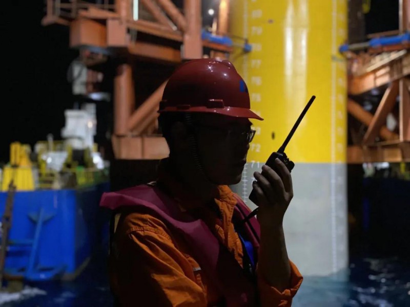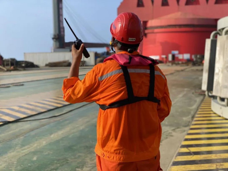 八月的南海,气候异常闷热,单桩施工作业期间平台气温超过35多度,甲板温度更是超过50多度,穿着厚厚的工作服和救生衣更是闷热,橘红色的工作服不一会儿就被汗水浸透,在高温酷暑下他们仍然坚守在一线,有序的指挥着各项工作。