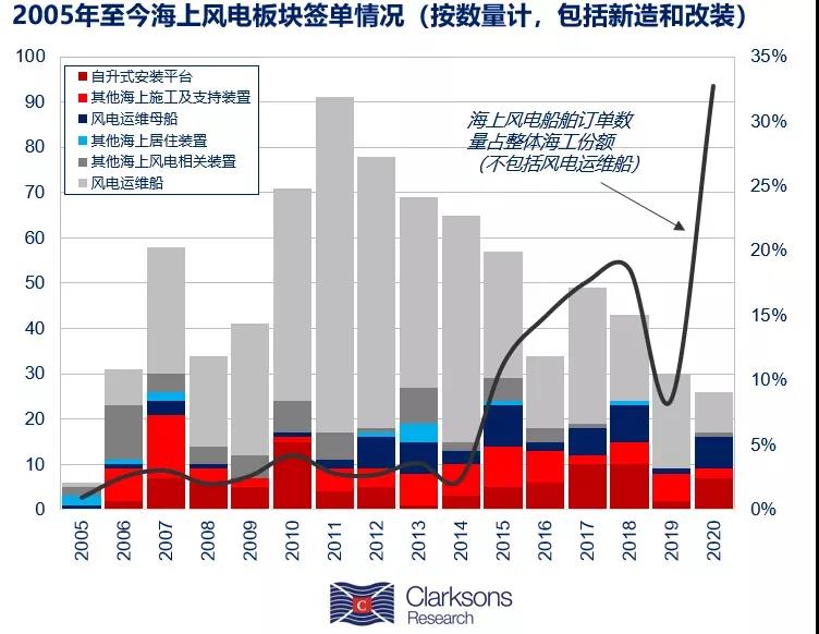 近年来快速增长的海上风电板块的新签订单已经成为低迷的海工市场中为数不多的亮点之一。据Clarksons Research的数据显示,2005年至今全球海上风电相关船舶及平台的新造和改装订单总计达783个;根据功能划分包括主要用于海上风电建设的自升式安装平台订单88个(占订单总量的11%)和其他海上施工及支持装置81个(10%),用于风电场运维的风电运维母船59艘(8%)和风电运维船482艘(62%),以及其他海上风电相关装置(包括勘探装置等)73个(9%)。若不包括风电运维船(因为尺度较小且数量较多),2005年以来海上风电板块的船舶新签订单数量已占整体海工市场订单的10%以上。
