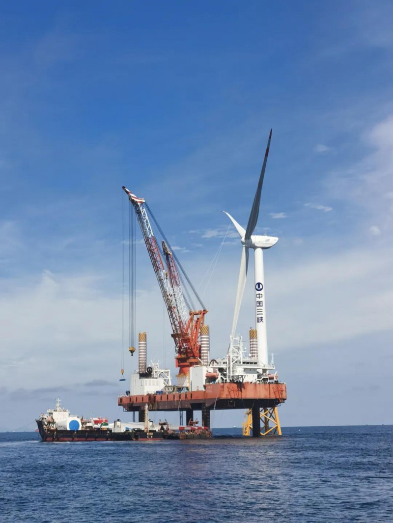 该风机采用芯柱式嵌岩三桩导管架基础,其整体刚度大、抗浪性强,掌握了海上风电芯柱嵌岩基础施工关键技术。首台风机成功吊装标志着阳江二期项目转入机电安装阶段,项目建设正式进入主体施工关键期,为集团公司在广东阳江地区建成首个集中连片规模化开发的“百万千万级”海上风电基地迈出了坚实一步。