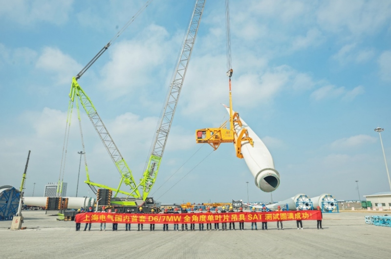 11月13日,上海电气风电集团D6/7MW全旋转式海上单叶片吊具在射阳港测试成功。国内首套全旋转式海上单叶片吊具问世,意味着上海电气风电集团打破了该领域国际垄断,再一次引领海上风电先进技术突破。