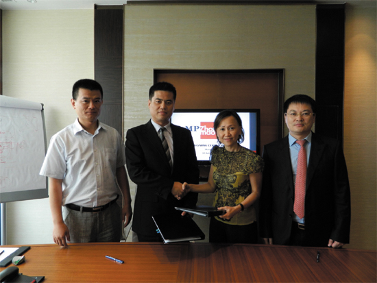 【图为:新中贸德瑞展览(上海)有限公司总经理张兴安同国际展会策划有限公司(MP International Pte Ltd)执行总裁潘美华女士握手,共同签署合作协议,新中贸德瑞执行董事江刚(右侧)、副总经理余洋(左侧)也一同出席本次签署仪式】