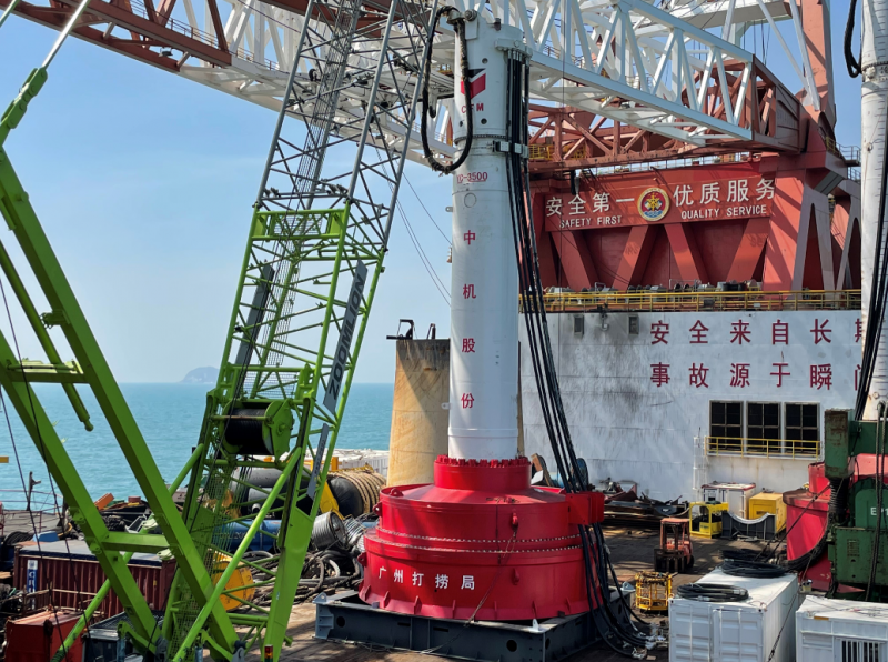 继2019年与龙源振华成功联合研制2500KJ国内首台套双作用液压打桩锤后,2021年2月8日,由中机锻压江苏股份有限公司为广州打捞局研制的3500KJ液压打桩锤在南海一锤打响,其锤击能量与德国生产的menck3500并列全球第一,标志着中机锻压具备了海上风电大直径单桩沉桩大型双作用液压冲击锤的研发、设计、制造能力,打破了外企在该领域的长期垄断,真正实现了核心领域关键重大装备的国产化和系列化。