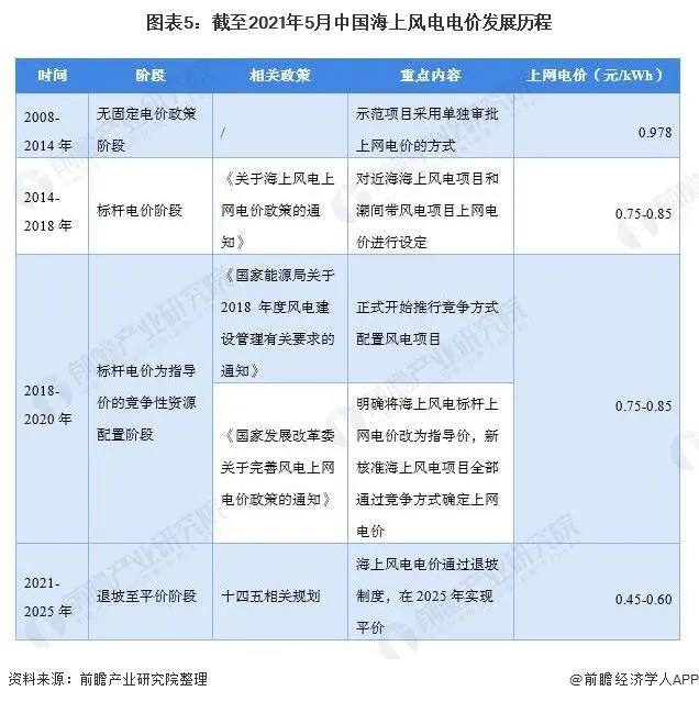 电价是风电产业发展的基石性经济政策,在支撑我国风电产业持续健康发展中起到了重要的作用。根据国家发改委发布的《关于完善风电上网电价政策的通知》,2019年起核准的海上风电标杆电价改为指导价,全部通过竞争方式确定上网电价,且上网电价不得高于当年核准的指导价;2018年底前核准且2021年底前全容量并网的海上风电项目可以享受核准时的上网电价。