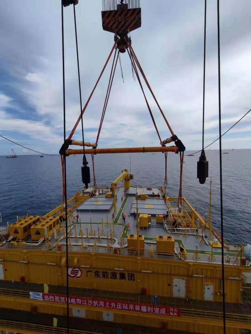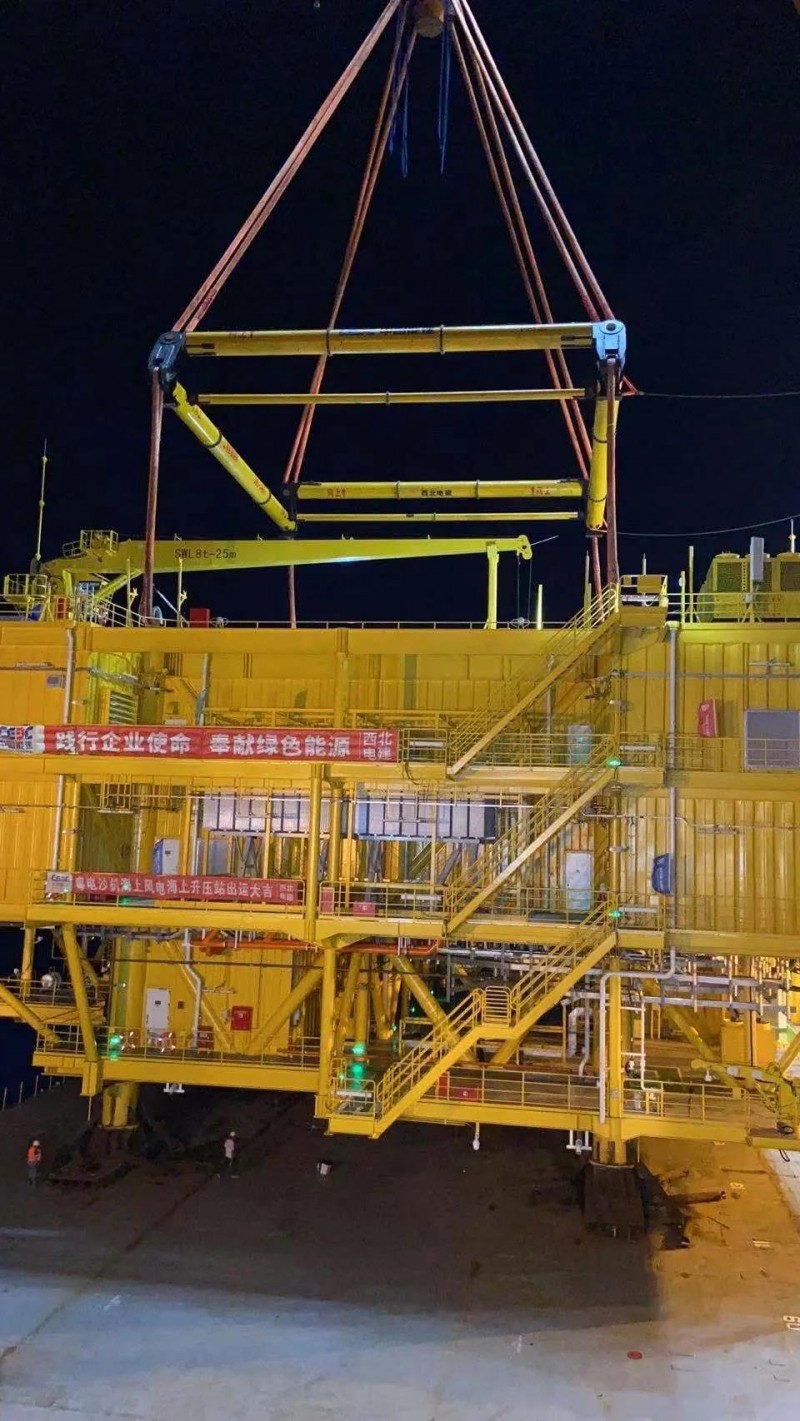 5月26日凌晨1:00,在广东阳江海上风场,由上海君威钢绳索具股份有限公司设计吊装方案并提供全套吊具的粤电阳江沙扒海上风电项目220KV海上升压站顺利安装就位。本次吊装的220KV海上升压站是粤电阳江沙扒海上风电项目最核心的组成部分,自重达3200T,主体长度达到39米,宽度为36米,高度为22米。整个吊装过程达到高标准要求,一气呵成,堪称完美。上海君威严谨、专业的吊装技术得到了升压站施工单位——西北电力建设工程有限公司的充分肯定和高度赞扬。