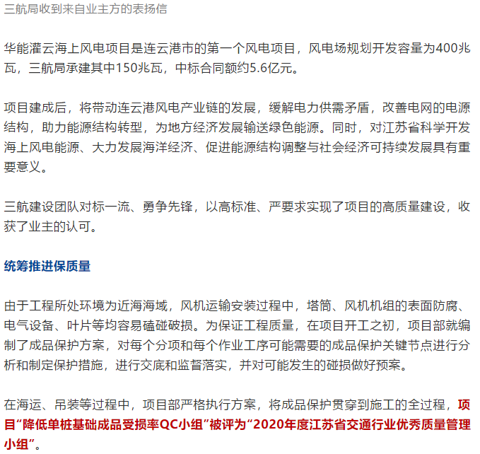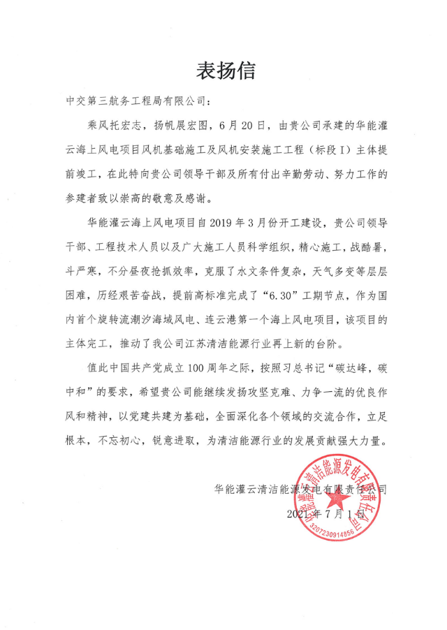 7月1日,项目部收到了华能灌云清洁能源发电有限责任公司的表扬信,信中高度肯定了项目部全体职工的辛勤劳动,希望与三航局全面深化各个领域的交流合作,为清洁能源行业的发展共同贡献强大力量。