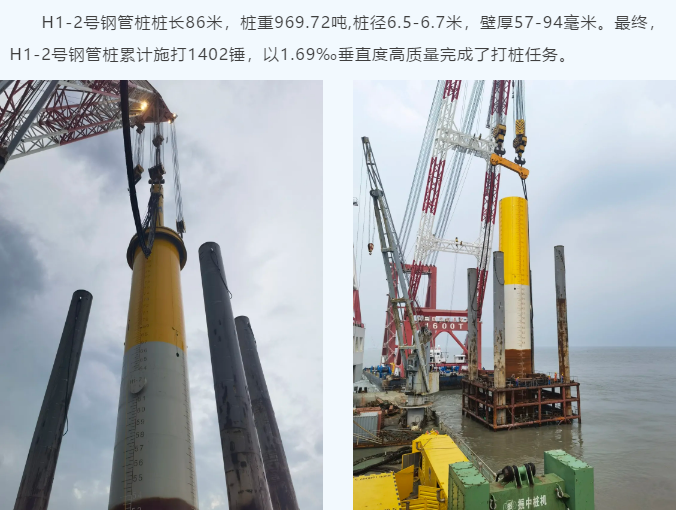 启东风场施工主要包括134台大兆瓦风机基础施工及风机安装施工,其中项目部承担的H1、H2两个标段的施工任务需完成84台风机基础及风机安装施工,目前,已累计完成66根钢管桩打桩,完成78.6%。