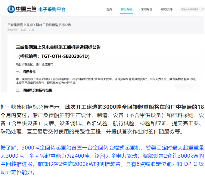 据了解,3000吨全回转起重船设置一台全回转变幅式起重机,臂架固定时最大起重重量为3000吨,全回转起重能力为2400吨。该船为全电力驱动,艉部设置2套约3000kW的全回转推进器,艏部设置2套约2000kW的侧推装置,具有8点锚泊定位能力和 DP-2 级动力定位能力。