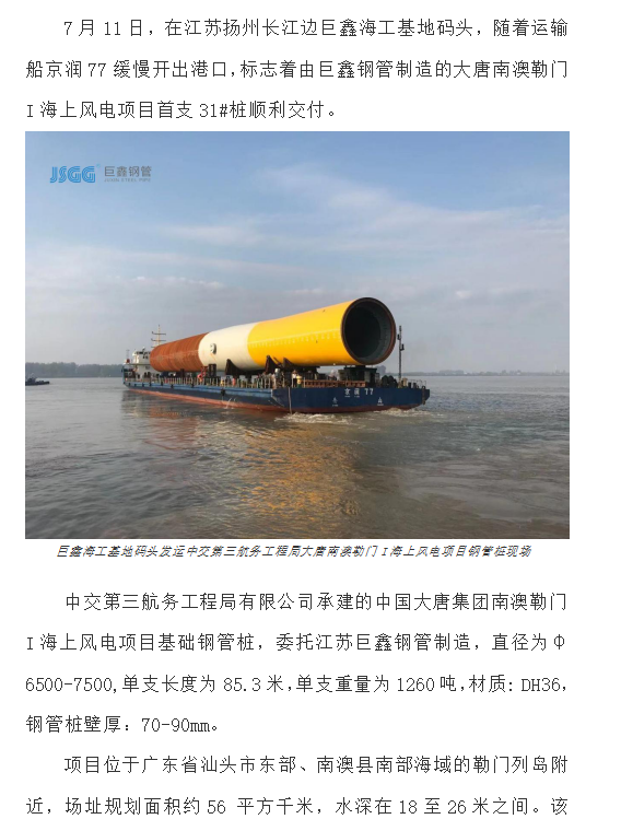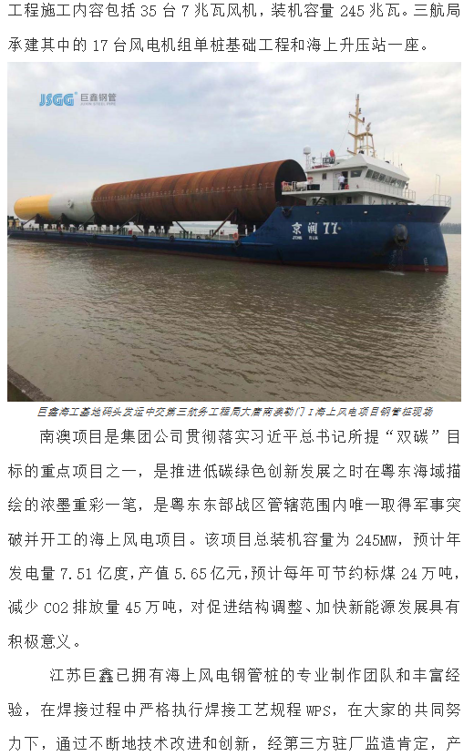 江苏巨鑫期盼和多方合作,长远谋划,各自发挥资源优势,积极推进新能源业务发展。不仅服务国内海上风电项目,更要服务“一带一路”沿线国家海上风电项目,逐步实现从“长江走向海洋,从江苏走向世界”的发展目标,共同落实总书记提出的“双碳”目标。