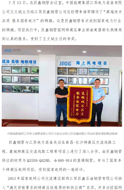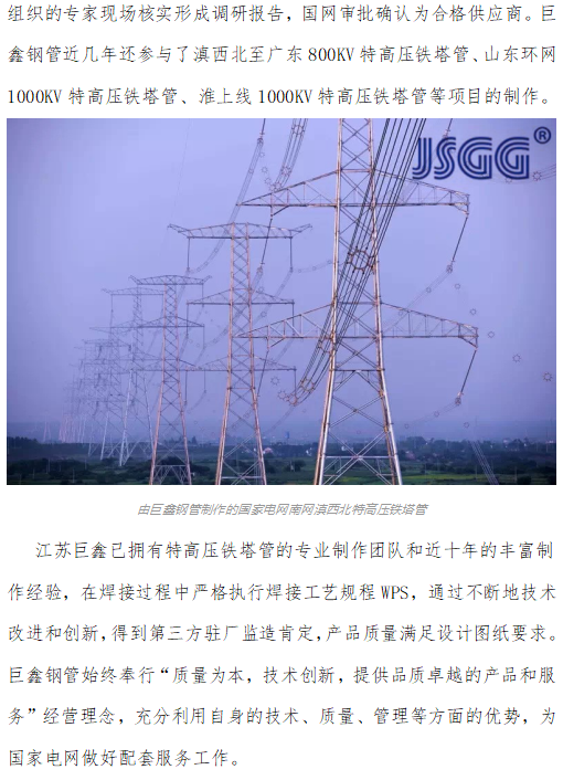 中国能建集团江苏电力感谢巨鑫钢管助力国电特高压钢管塔