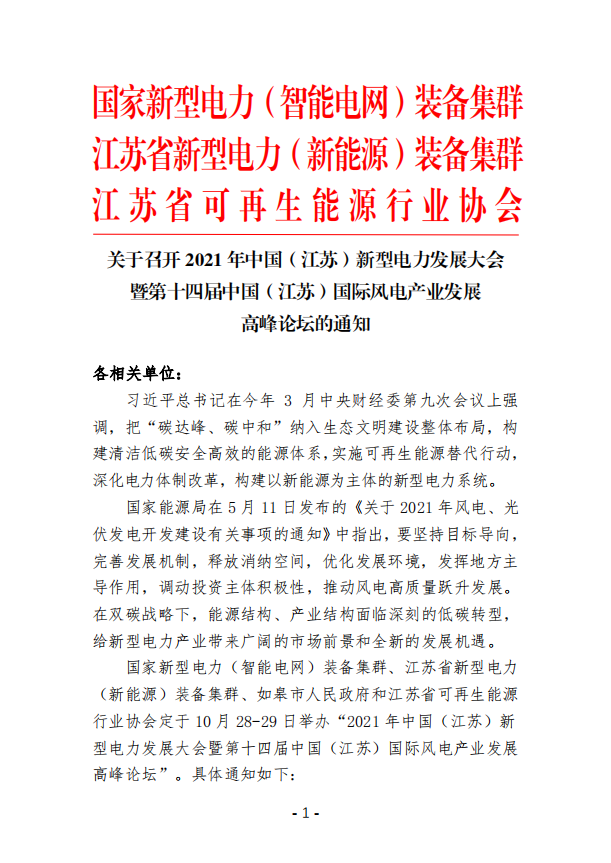 关于召开2021年第十四届中国(江苏)国际风电产业发展高峰论坛的通知