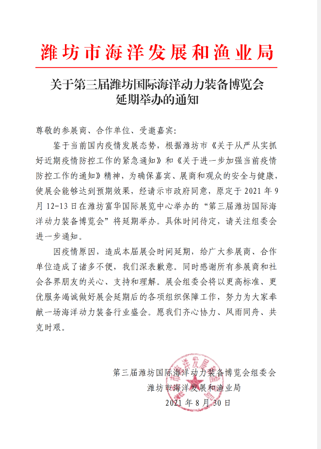 关于第三届潍坊国际海洋动力装备博览会延期举办通知