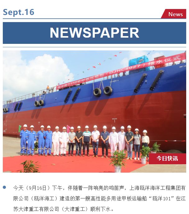 9月16日下午,伴随着一阵响亮的鸣笛声,上海瓯洋海洋工程集团有限公司(瓯洋海工)建造的第一艘高性能多用途甲板运输船“瓯洋101”在江苏大津重工有限公司(大津重工)顺利下水。