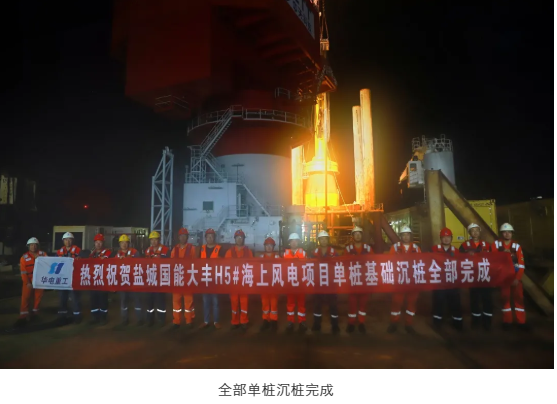 10月6日19:21,历经24个小时的持续作业,大丰H5风电场最后一根单桩基础顺利沉桩到位,标志着由华电重工承建的盐城国能大丰H5#海上风电场风机单桩基础全部沉桩完成,实现了该项目重大工程节点!