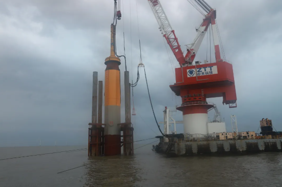 该项目2020年8月正式开工,华电重工认真策划、科学组织,先后引进“利通1号”、“博强58”两个船机开展单桩基础沉桩施工,项目部克服新冠肺炎疫情和桩基供货紧张的不利影响,始终保持着高质量推进、高速度建设的施工状态,2021年4月9日顺利完成30根单桩基础沉桩。