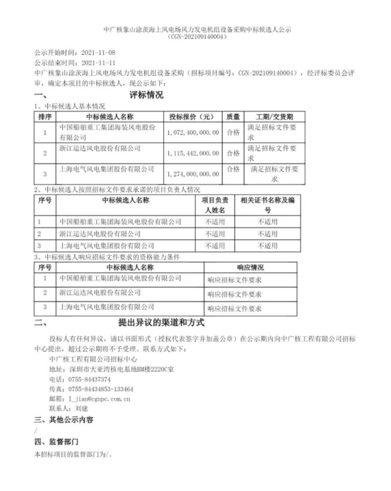 11月8日,中广核电子商务平台发布《中广核象山涂茨海上风电场风力发电机组设备采购中标候选人公示》,确定第一中标候选人为中国海装。