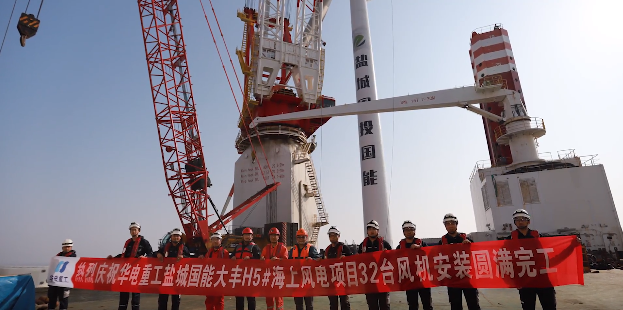 11月16日,随着29号风机最后一支叶片精准对接,由华电重工承建的盐城国能大丰H5项目完成全部风机吊装,标志着海上主体工程全部完工,为后续风场全容量并网打下坚实基础。
