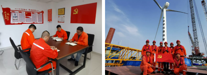 项目部共有18名管理人员,根据项目的规模和特点,项目部第一时间成立大丰H5项目党小组,把组织阵地前移项目一线,实现哪里有党员,哪里就有党的组织,突出党建引领作用重点工程项目实现党组织全覆盖。组织成立“逐风”党员突击队、青年安全生产示范岗,坚守一线岗位,不畏艰难险阻,无惧海浪波涛,不舍昼夜攻坚,力保项目并网发电工期节点,战斗堡垒各擅胜场,有力保障项目进度。