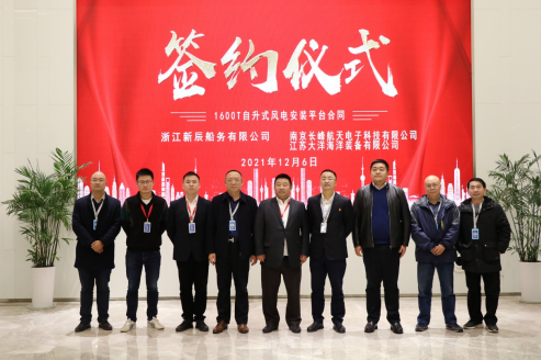 2021年12月6日,中国航天科工集团旗下江苏大洋海洋装备有限公司(以下简称“江苏大洋海装”)与浙江新辰船务有限公司(以下简称“浙江新辰”)在南京举行了1艘1600T自升自航式一体化海上风电安装平台合同签约仪式。这是双方继今年3月份的3000T浮吊合同以及11月份12000HP大功率拖轮租赁合同签约后的又一次合作。南京长峰航天电子科技有限公司副总经理钱宇光、江苏大洋海装总经理荀金标、浙江新辰总经理张存斌分别代表三方签字。航天发展总经理王文海出席并见证签约仪式。