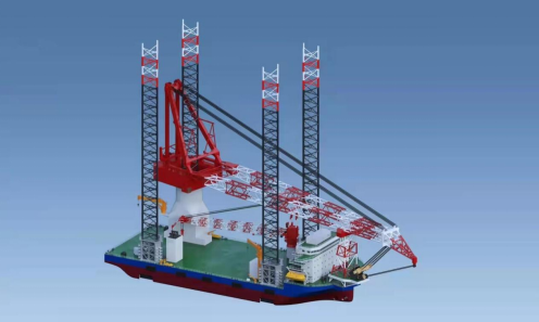 同时配备一台1600T绕桩式海工吊机和一台250T辅助吊机,采用齿轮齿条式升降系统,桁架式桩腿,长度120米,可满足最大作业水深70米要求。甲板上可容纳4套6.8MW风机、3套10MW风机或2套12MW风机,并具备15MW及以上风机安装能力。