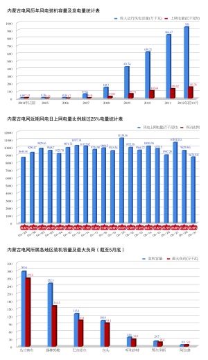 2009年,电网单日上网电量最高比例突破15%;2010年,电网单日上网电量首次突破20%大关;2011年,风电日上网电量创24%的历史新高。随着上半年采暖期的结束,内蒙古电力公司通过优化电网运行方式,采取火电机组深度调峰等措施,实现了风电的大比例接入。