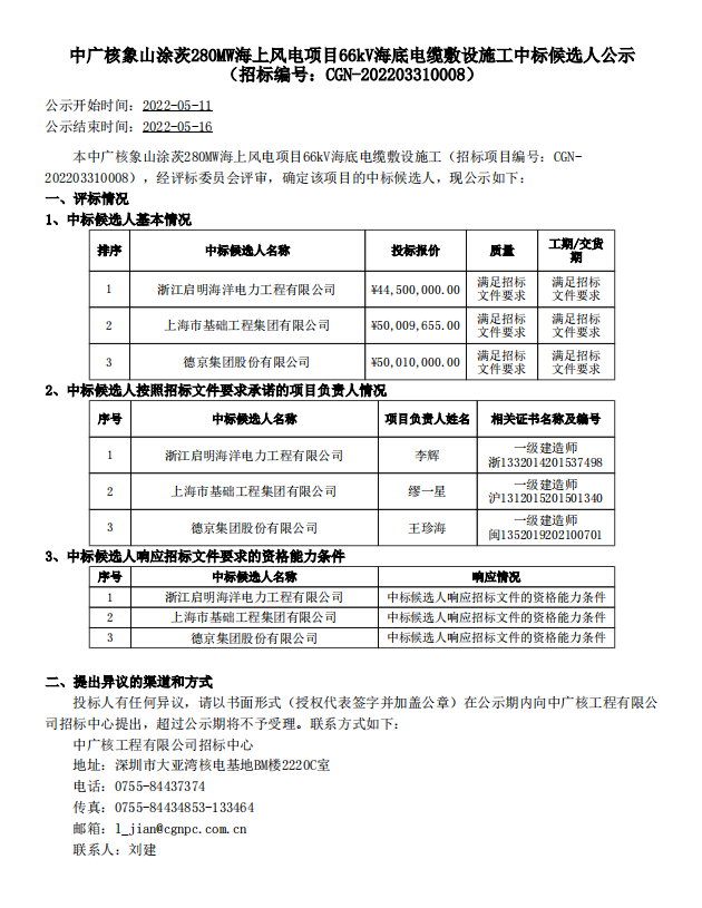 中广核象山涂茨280MW海上风电项目66kV海底电缆敷设施工中标候选人公示